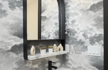 Mirror treatment over Bathroom vanities with wall mounted lighting