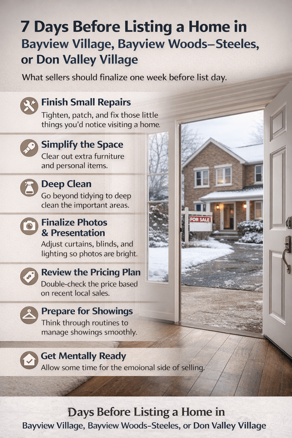 in Bayview Village, Bayview Woods–Steeles, or Don Valley Village🏠The final week before listing a freehold home is often overlooked, but it can quietly make a big difference. At this point, the goal isn’t big renovations or major changes. It’s about finishing the details so buyers feel confident from the moment they walk in. Here areContinue reading “7 Days Before Listing a Home”